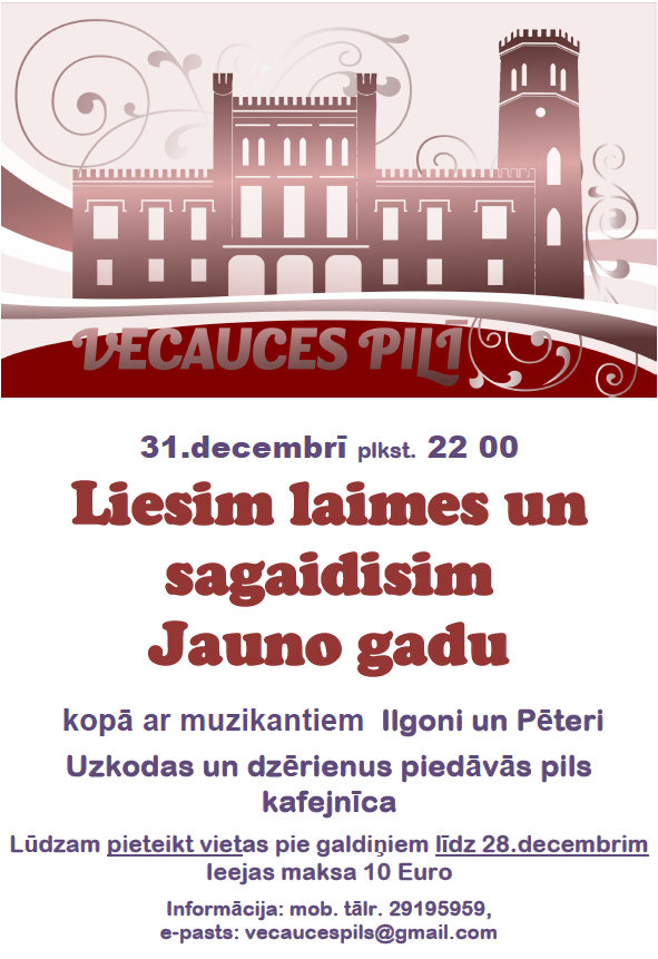 Vecauces pilī 31.decembrī plkst. 22 00 Liesim laimes un sagaidīsim Jauno gadu kopā ar muzikantiem Ilgoni un Pēteri. Uzkodas un dzērienus piedāvās pils kafejnīca Lūdzam pieteikt vietas pie galdiņiem līdz 28.decembrim. Ieejas...25.12.2017.