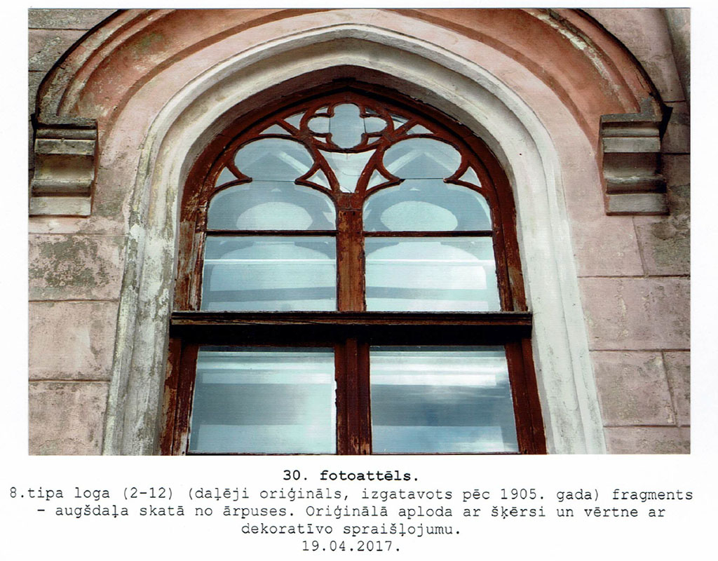 Tika veikta vēsturisko materiālu izpēte; logu un durvju inventarizācija, nosakot orģinālās daļas un aprīkojumu- viras, rokturus fiksējošo mehānismu. Tika noteikts esošo logu un durvju tehniskais stāvoklis un veicamo darbu veids. Izpētes darbam pievienots katra stāva plāns ar izpētes laikā numurētām telpām, kurās numurētas visas ārējās un iekšējās durvis un logi. Visi logi un vēsturiskās durvis iedalītas tipos un aprakstītas. Sekundārās durvis, kurām nav amatnieciskas un vēsturiskas vērtības, tikai numurētas. Darbam pievienots bagātīgs ilustratīvais materiāls. Darbu veica arhitekte Kristīne Veinberga un celtniecības arheologs Juris Zviedrāns.