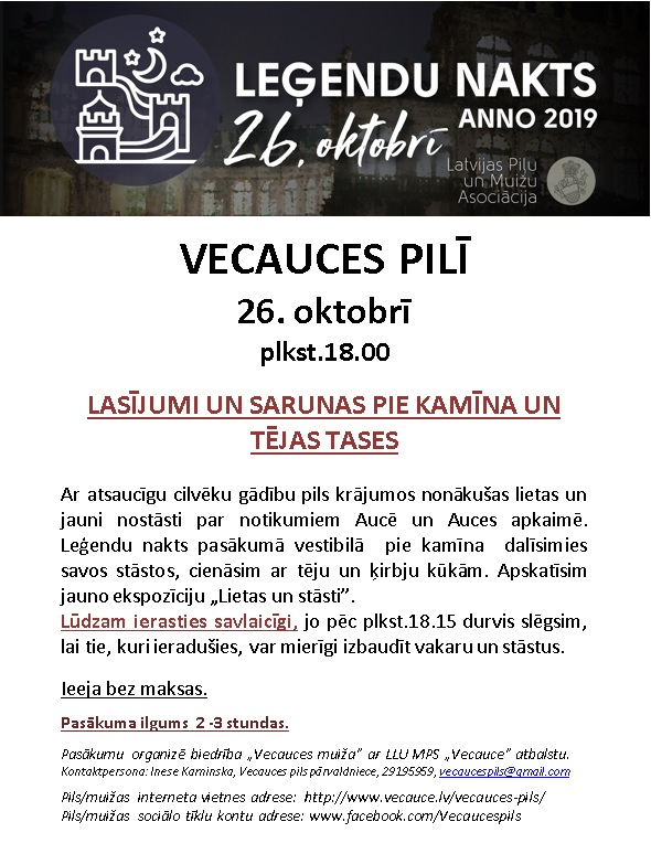 Ar atsaucīgu cilvēku gādību pils krājumos nonākušas lietas un jauni nostāsti par notikumiem Aucē un Auces apkaimē. Leģendu nakts pasākumā vestibilā pie kamīna dalīsimies savos stāstos, cienāsim ar tēju un ķirbju kūkām. Apmeklēsim jauno ekspozīciju...18.10.2019.