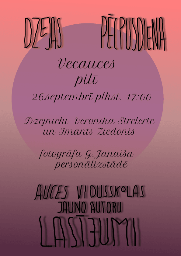 Vecauces pilī 26.septembrī plkst.17:00 Auces vidusskolas jauno autoru lasījumi Dzejnieki Veronika Strēlerte Imants Ziedonis Fotogrāfa G.Janaiša personālizstāde26.09.2018.