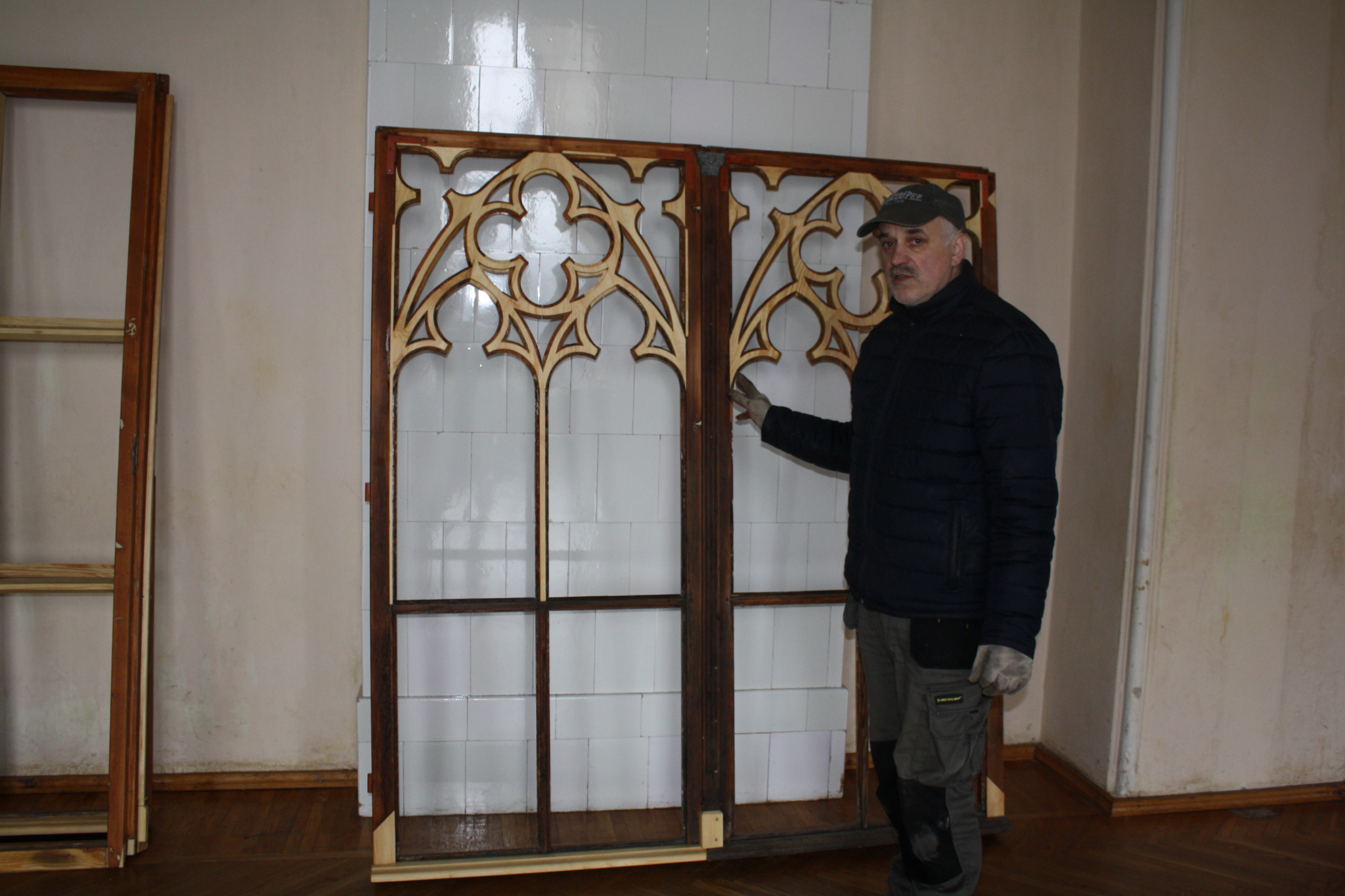 Šobrīd prasmīgu galdnieku rokās restaurācijai nodots viens logs. Logam tiek atjaunota vērtņu ģeometrija, protezēta konstrukcija, sakārtots un piemeklēts atbilstošs aprīkojums. Tiek atjaunota ārējā noseglīkste kanelūrēta pilastra veidā ar cinkā lietu kapiteli. Logi tiek iestikloti ar lineļļas ķiti. Katrs dekoratīvo elementu stikls tiek piegriezts un stiklots atsevišķi. Logiem paredzēts atjaunot orģinālo krāsojumu gan ārpusē, gan interjērā.